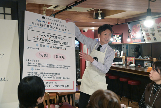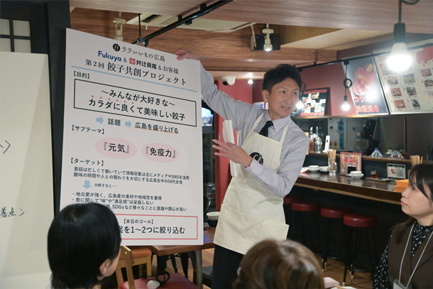 「これだけ喜んでいただけるなら、第2弾も作りたいという想いが高まりました。」と、第二弾のプロジェクトリーダーを務める月山淳一さんは語ります。第1弾同様、プロジェクトメンバーを広く募集し、餃子愛、広島愛にあふれる11名のメンバーと、餃子のプロフェッショナル井辻食産さんとともに開発を進めることに。地元広告代理店の皆さんにも毎回会議に参加いただき、様々な議論を行いました。目指すゴールは、「カラダに良くて美味しい餃子で広島を盛り上げること」。“餃子を広島の文化に”という井辻食産さんの想いも合わさって、地域活性にもつながればと考えています。