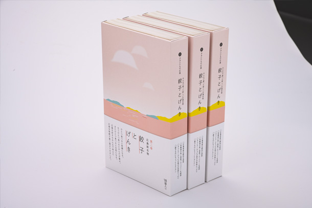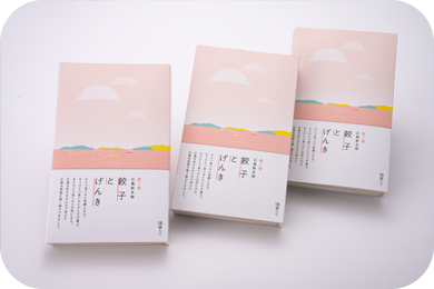 「餃子としあわせ」が瀬戸内の多島美だったのに対し、第2巻「餃子とげんき」のパッケージは、安芸津の境港をモチーフに。色味もピンクをベースにしやさしい色味。「店頭で第一弾の“餃子としあわせ”と並べると、本棚のようにも見えるんです。この箱に餃子が入っているとは思わないという声もよくいただきます。「手に取っていただいた方々が、ギフトのシーンや、食卓での団らんで「笑顔」と「会話」が生まれるきっかけになって、体も心も元気になっていただきたいですね。」とプロジェクトメンバーの皆さん。